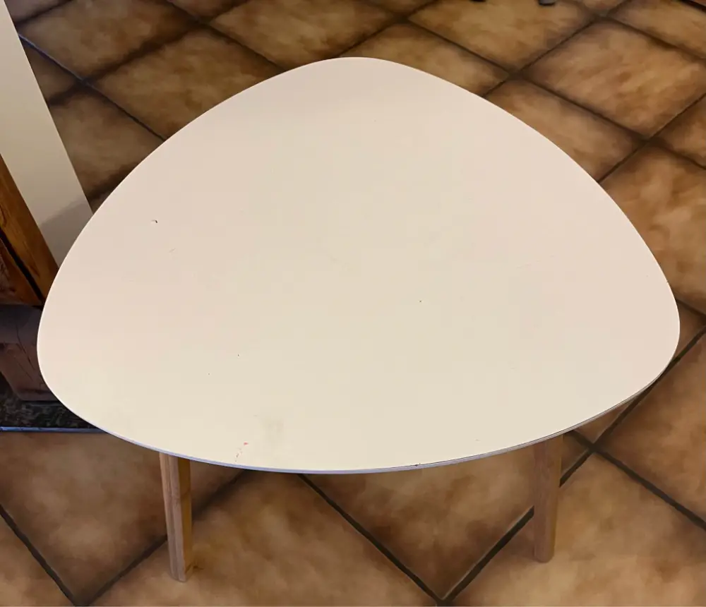 Height 45 cm, diameter approx. 55 cm, white table top (current stains), 3 brown table legs