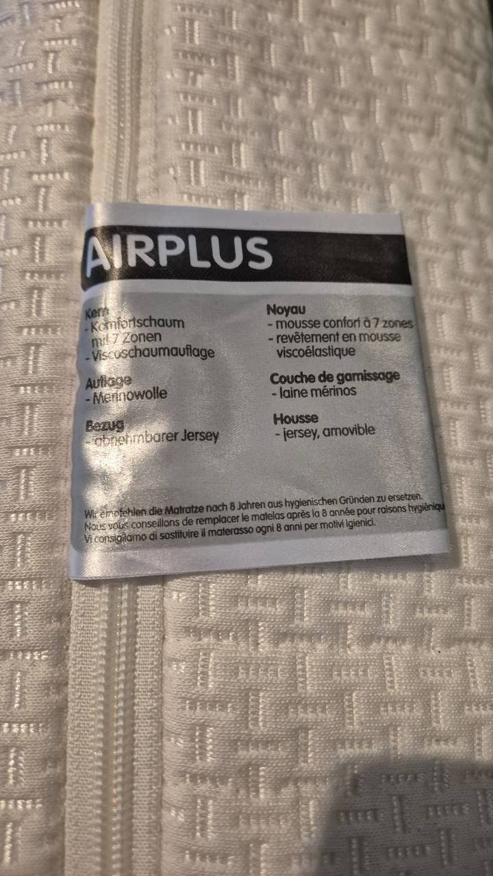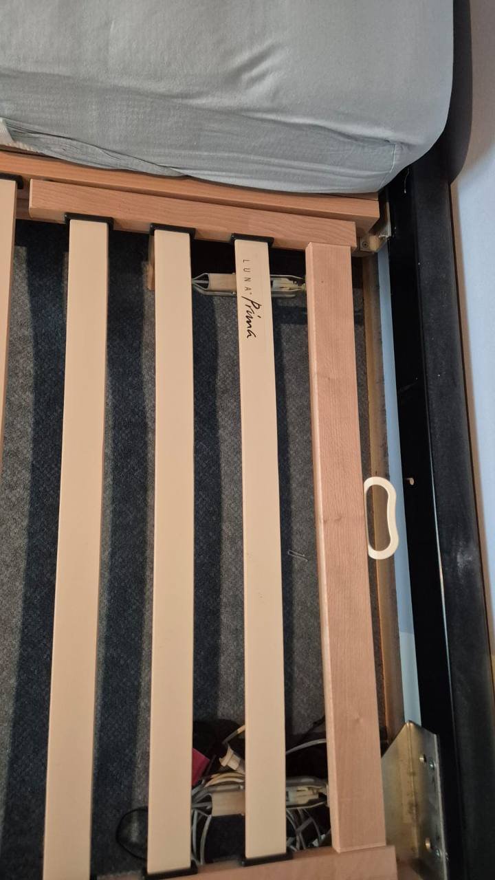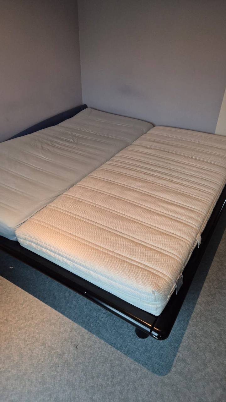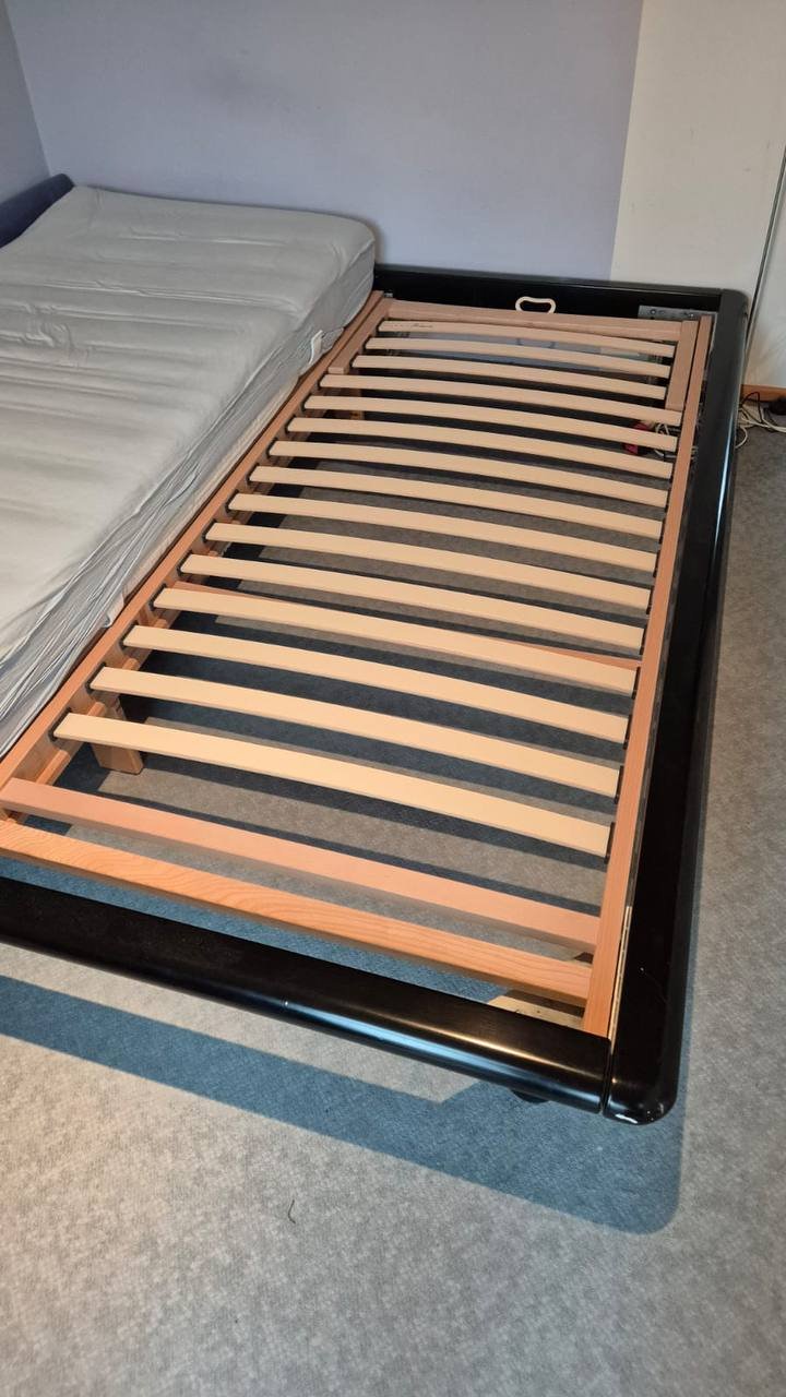 Komplettes Bett mit schwarzem Metallrahmen, Holzlattenrost und zwei Sanaflex/Airplus Matratzen. Guter, funktionsfähiger Zustand.