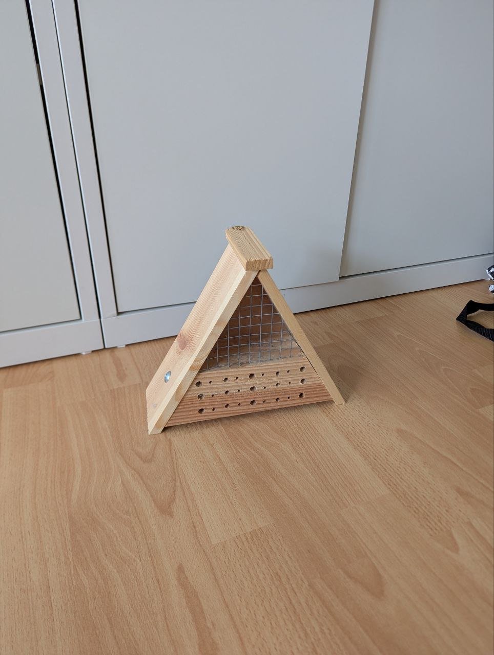 Bienenhotel aus Holz mit dreiecksförmiger Form und mehreren Nistplätzen. Abholung bevorzugt am Sonntag oder Montag Abend.