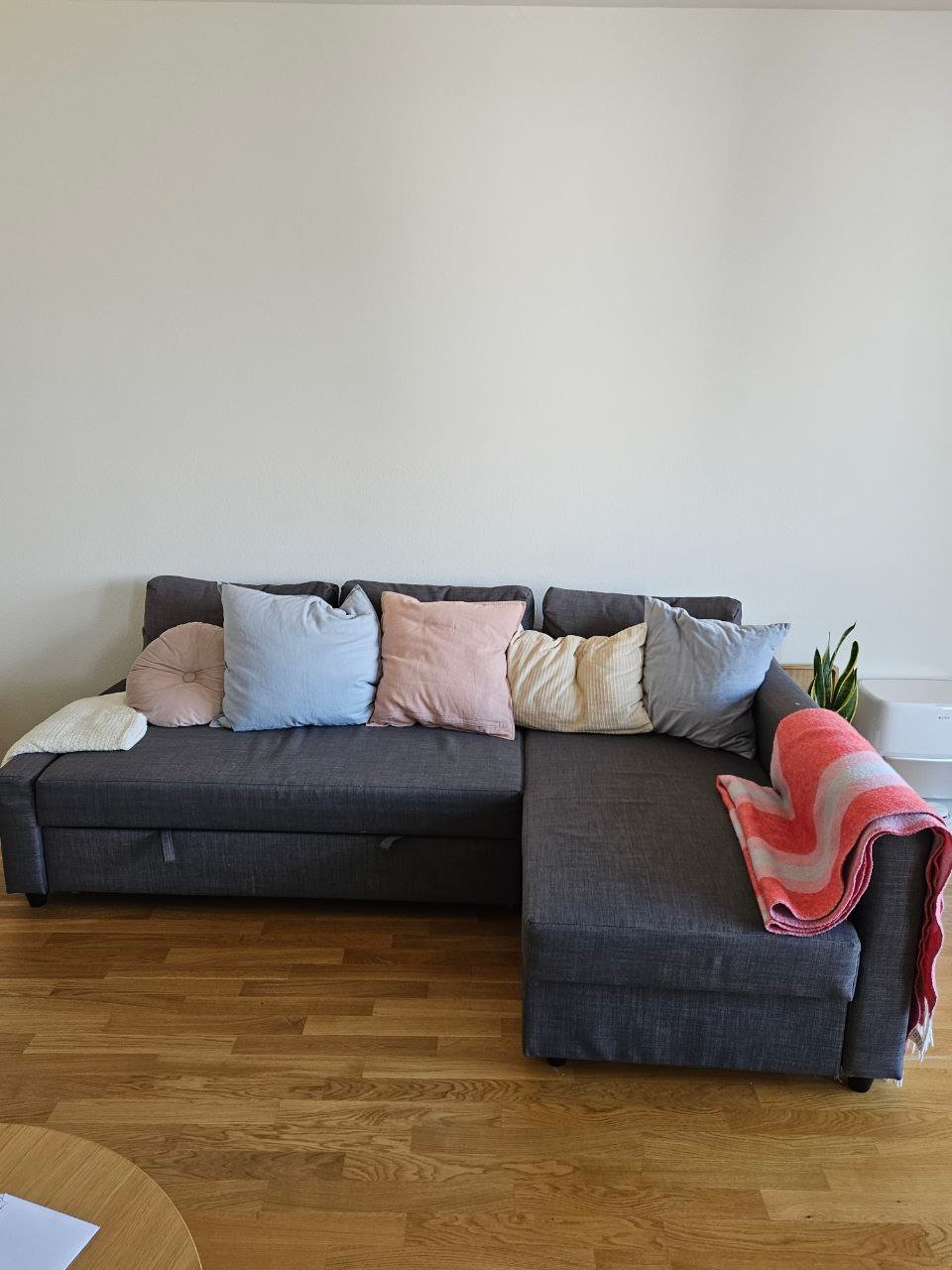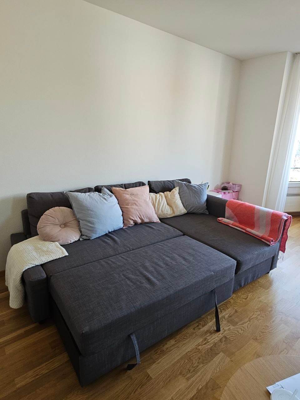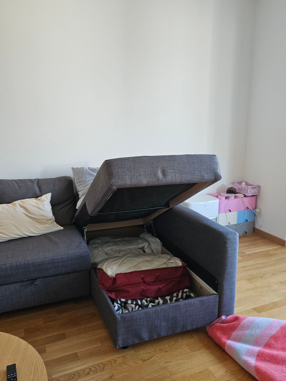 Graue Ecksofa mit Bettfunktion und Stauraum. Muss fast am ganzen Stück abgeholt werden, da gewisse Schrauben nicht mehr lösbar sind. 2. Stock. Mit Kissen.