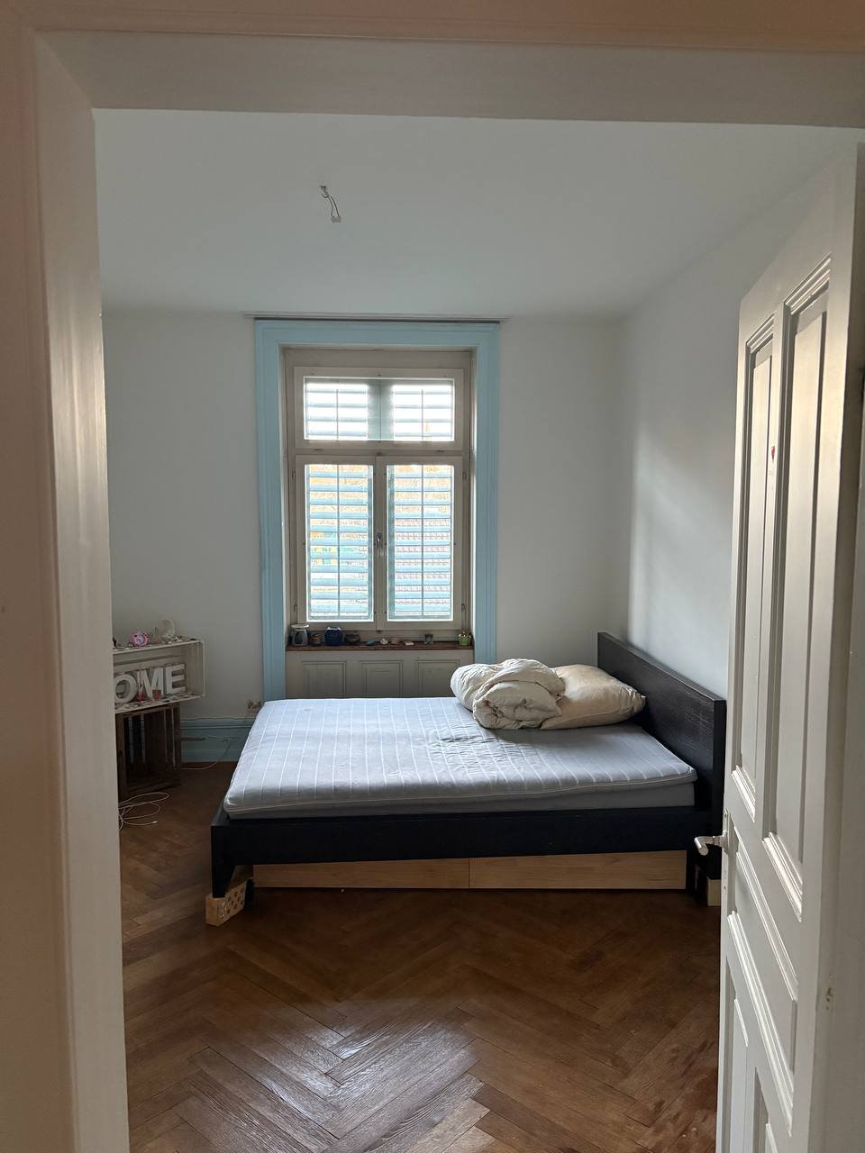 Bett mit schwarzem Rahmen und grauer Matratze.