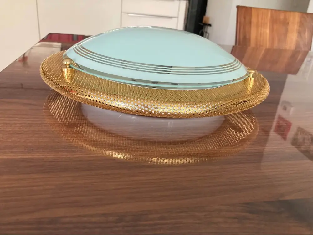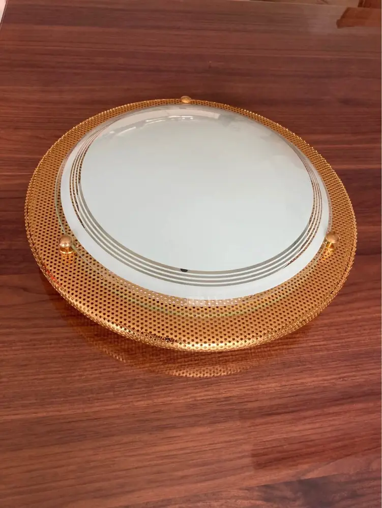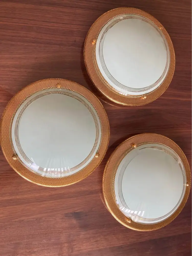 3 pcs. ceiling lamps for apartment hallway. Round, diameter 30cm, light bulb, glass cover bordered with brass hole plate.