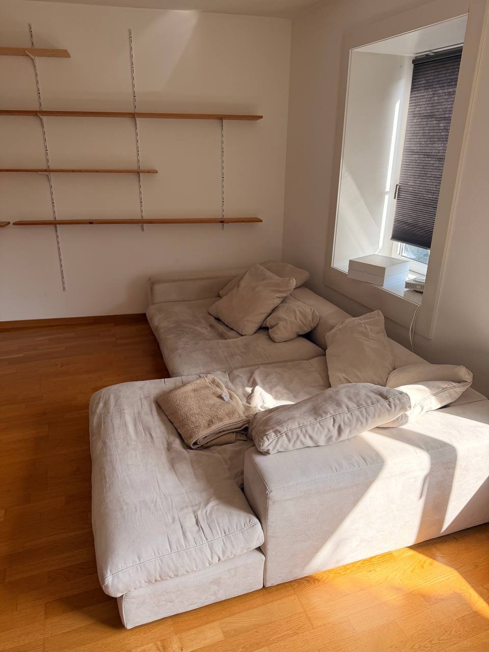Großes, hellgraues Sofa mit mehreren Elementen, Kissen und Decke. Teilweise verblasst vom Gebrauch, aber noch funktional.